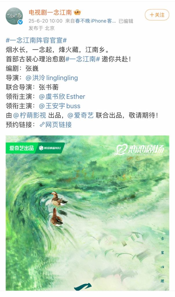 Tim produksi menulis, “Asap dan air mengalir panjang, sebuah pemikiran muncul, nyala tersembunyi di Kota Jiangnan. Drama penyembuhan psikologis kostum kuno pertama #一念江南# mengundangmu untuk bergabung!”