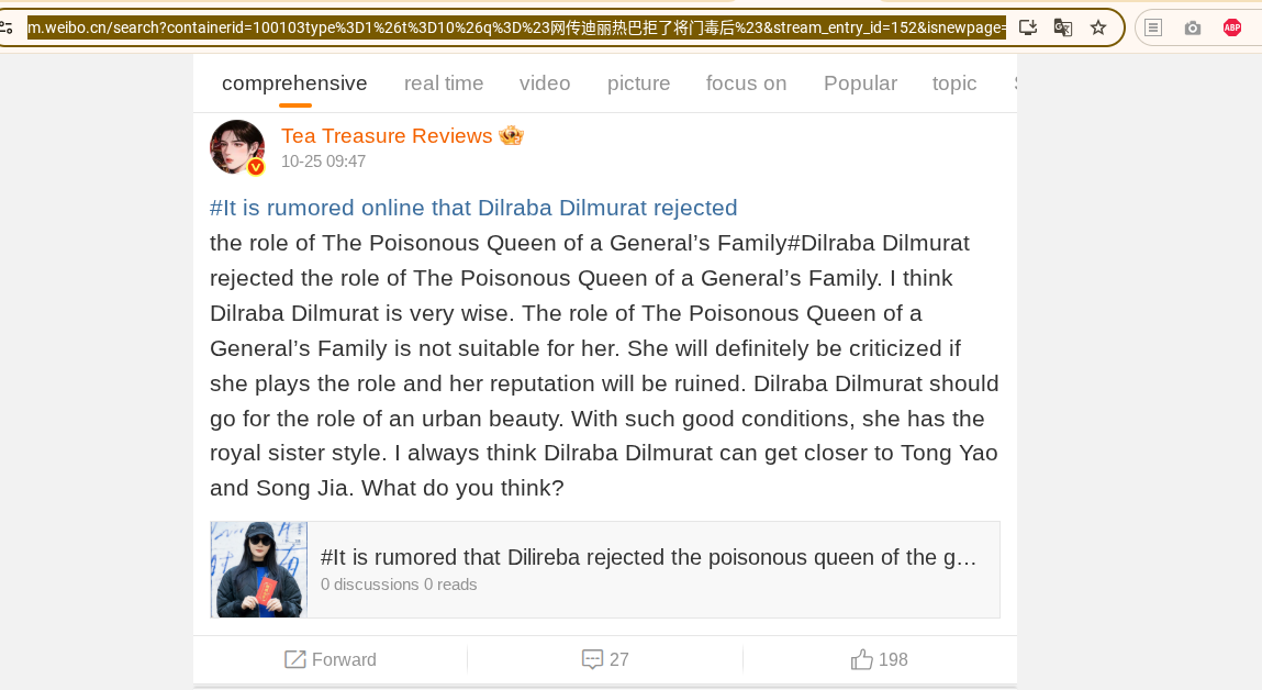 Menariknya, dua hari sebelumnya, pada 24 Oktober, muncul rumor di Weibo yang menyebutkan bahwa Dilraba Dilmurat menolak tawaran membintangi drama tersebut. Seorang pengguna Weibo menulis, “Kudengar Dilraba Dilmurat menolak membintangi The Poisonous Queen of a Military Family. Apa pun hasil akhirnya, dia memang selalu pandai memilih naskah! Dari peran klasik sampai modern, dari karakter lembut sampai mandiri, dia selalu tahu mana yang paling cocok untuk dirinya. Mungkin kali ini dia menolak karena ada proyek lain yang lebih sesuai. Mari kita tunggu kejutan darinya berikutnya!”