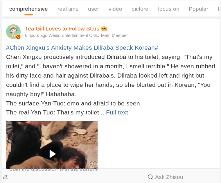 Dalam video terlihat Dilraba memakai kostum hitam berada di samping Chen Xingxu yang berbaring dalam kondisi berambut gondrong dan berjenggot. Interaksi ini memperlihatkan sisi usil aktor tampan itu. Dia memperkenalkan Dilraba dengan toiletnya, berkata, “Itu toiletku.” Dia melanjutkan, “Aku belum mandi selama sebulan, bauku luar biasa.”