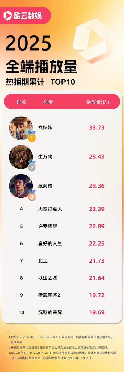 Posisi puncak ditempati oleh drama keluarga berlatar era perubahan sosial Tiongkok pada paruh kedua abad ke-20, Six Sisters (六姊妹), yang dibintangi Mei Ting dan Lu Yi. Drama ini mencatatkan total kumulatif penayangan lintas platform selama masa tayang panas sebesar 3,373 miliar kali, menjadikannya drama dengan jumlah penayangan tertinggi versi Kuyun pada 2025.