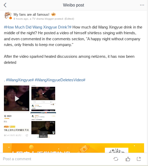 Beberapa saat setelah itu, dia menghapus video tersebut, mungkin demi menghindari kontroversi. Seorang pengguna Weibo membahas beberapa tindakan sang aktor di media sosial tahun lalu yang sepertinya terkesan impulsif hingga ia perlu mengoreksi atau menghapus postingannya.