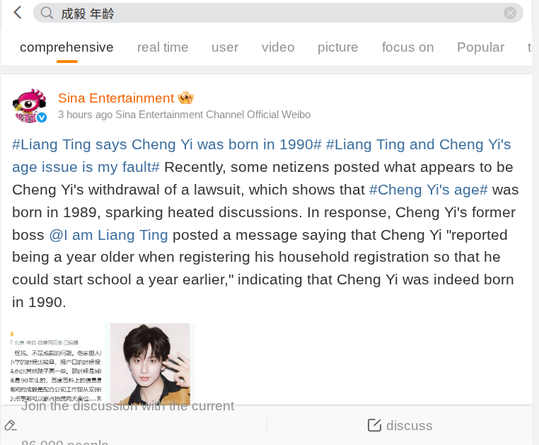 Namun setelah Cheng Yi memasuki dunia hiburan, Liang Ting merasa lebih tepat untuk kembali menggunakan usia sebenarnya. Karena itulah muncul perbedaan informasi yang kemudian menimbulkan kebingungan di kalangan publik. Ia juga menegaskan bahwa Cheng Yi tetap merupakan kelahiran tahun 1990.