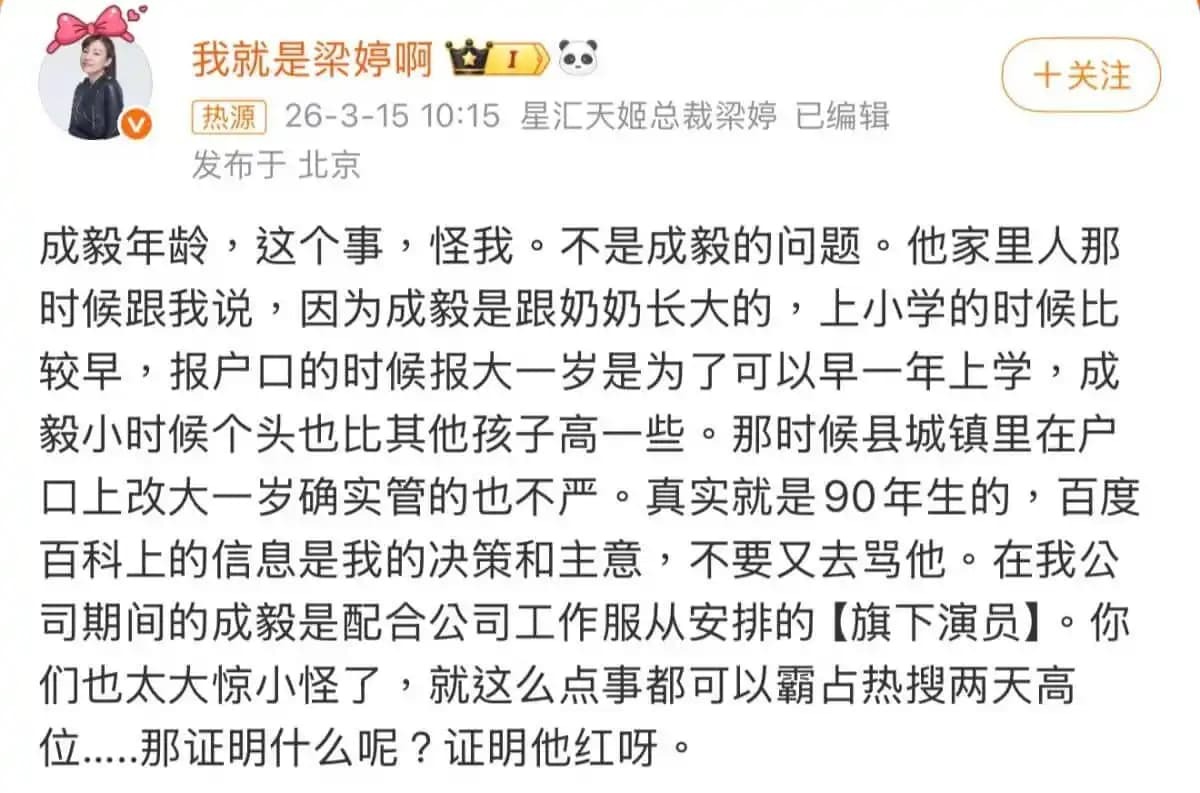 Di tengah ramainya perbincangan, mantan manajer Cheng Yi, Liang Ting, akhirnya angkat bicara melalui sebuah unggahan di media sosial. Ia mengakui bahwa memang pernah ada perubahan pada usia sang aktor, tetapi menjelaskan bahwa hal itu terjadi sejak masa kecil.