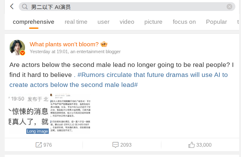 Namun, ada juga yang melihat tren ini sebagai sesuatu yang realistis di masa depan industri hiburan. “Drama pendek berbasis AI sekarang bahkan bisa menciptakan pasangan di layar dan merekam behind-the-scenes tanpa khawatir soal skandal. Rasanya beberapa aktor benar-benar akan kehilangan pekerjaan,” komentar pengguna lain.