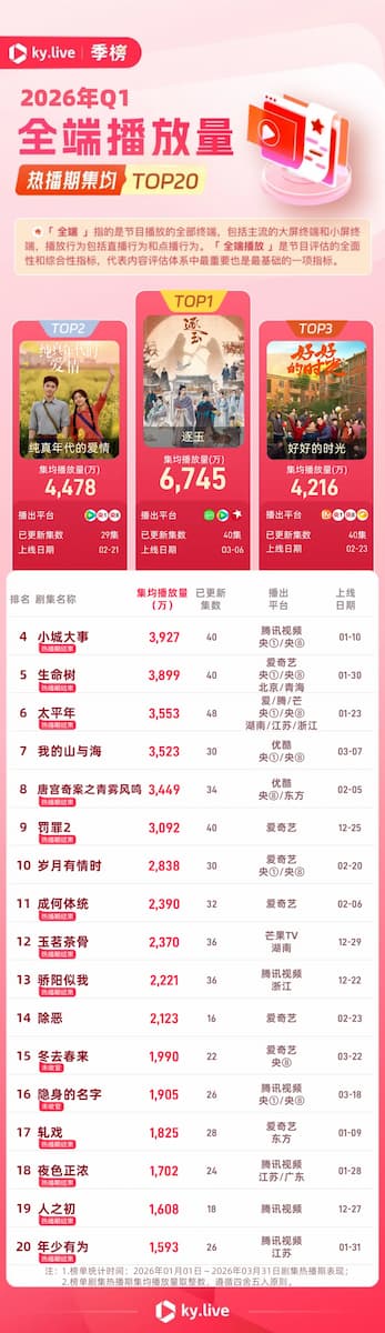 Keberhasilan Pursuit of Jade terlihat dari jumlah penayangan rata-rata per episode yang mencapai 67,45 juta, sebuah pencapaian yang disebut sebagai “kemenangan mutlak” dalam laporan kuartal ini. Di posisi kedua, drama berlatar era Love Story in the 1970s yang dibintangi Chen Feiyu dan Sun Qian berhasil mengumpulkan 44,78 juta penayangan, disusul oleh Wonderful Times di peringkat ketiga dengan 42,16 juta penayangan. Dominasi ketiga judul ini mempertegas pergeseran selera penonton yang mulai mengapresiasi narasi yang lebih variatif dengan kualitas produksi yang mumpuni.