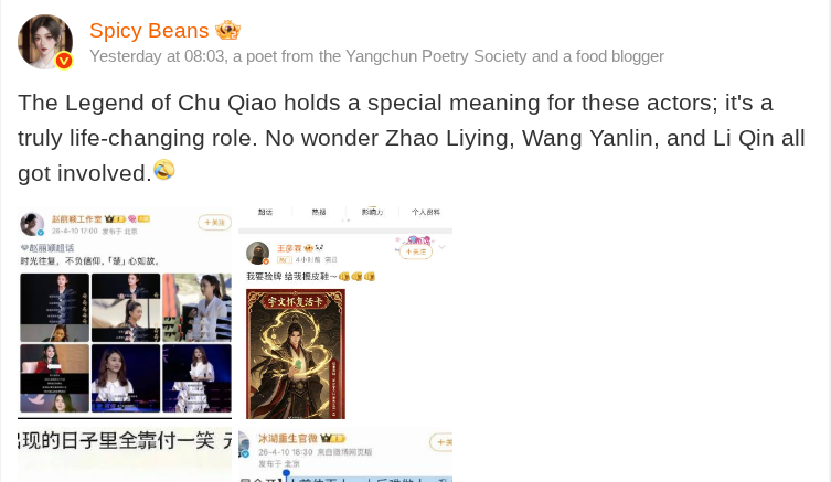 Pada 10 April, Zhao Liying memicu gelombang emosi penggemar saat mengunggah deretan cuplikan wawancara dirinya mengenai perannya dalam Princess Agents (楚且传). “Beberapa orang layak dilindungi sepanjang hidup,” tulis aktris yang memerankan Chu Qiao tersebut di akun pribadinya. Unggahan ini segera dibanjiri lebih dari 50.000 komentar dalam waktu singkat. Tidak hanya itu, studio resmi Zhao Liying juga merilis pesan bertajuk “Waktu berlalu, iman tidak pernah mengecewakan, hati Chu tetap sama,” yang menekankan inti semangat kebebasan dan kesetaraan dari karakter tersebut.
