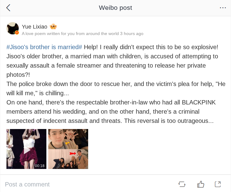 Menurut penelusuran LayarHijau pada 18 April terkait rumor yang beredar di Weibo ini, memang terdapat sejumlah pemberitaan di media Korea Selatan mengenai kasus dugaan pelecehan seksual yang melibatkan seorang pria berusia 30-an. Dalam pemberitaan tersebut, identitas pria tidak diungkap, namun di komunitas online muncul spekulasi yang mengaitkannya dengan kakak laki-laki Jisoo.