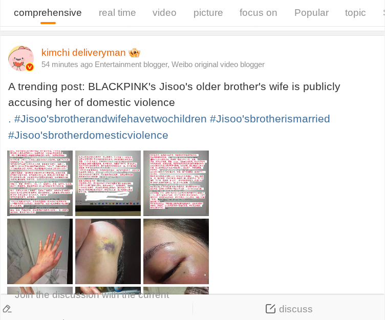 Di sisi lain, muncul pula klaim terkait dugaan kekerasan dalam rumah tangga yang beredar melalui akun Instagram Korea dengan nama pengguna rocketmag_official. Dalam unggahan tersebut disebutkan adanya surat tulisan tangan yang diduga dibuat oleh istri kakak Jisoo, yang berisi klaim mengalami kekerasan fisik, makian, serta ancaman berulang dalam hubungan rumah tangga. Unggahan tersebut juga menyebut adanya perawatan medis dan tekanan psikologis yang dialami, serta menyatakan bahwa konflik dalam keluarga disebut semakin meluas. Namun, informasi ini beredar di media sosial dan belum dapat diverifikasi melalui sumber resmi.
